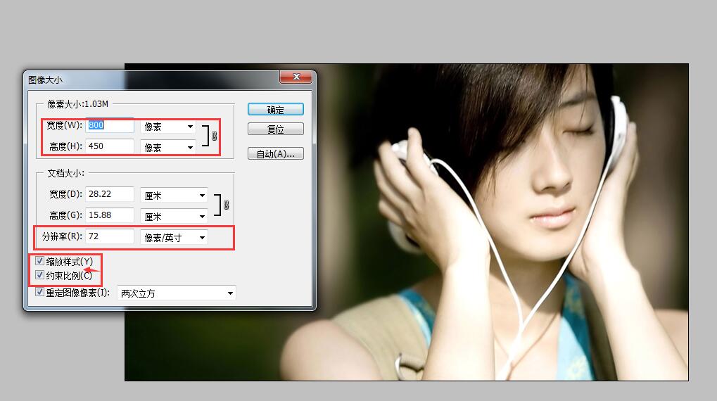 第一步;在phptoshop中打开你需要处理的图片,然后点击图像→图像大小,如图所示,图片的宽度尽量保持在800~900像素之间(具体看网站设计的内容页宽度大?。叨劝凑毡壤纯?!分辨率为72,我们可以看到此时图片大小为1.03M,显然是不符合网站所用!